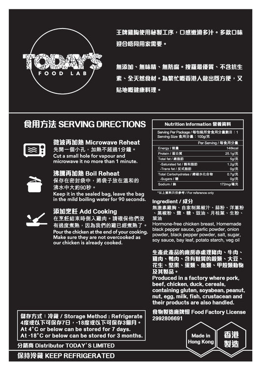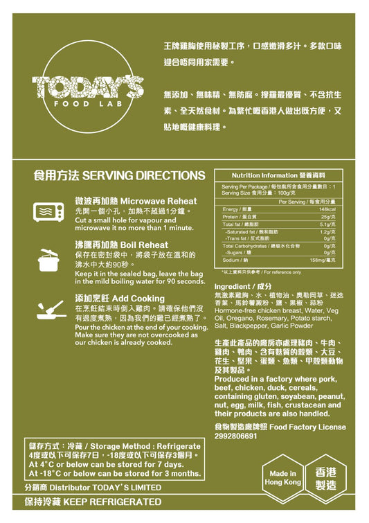 我哋嘅即食雞胸選用高質素、無激素同無抗生素嘅泰國雞肉製成。