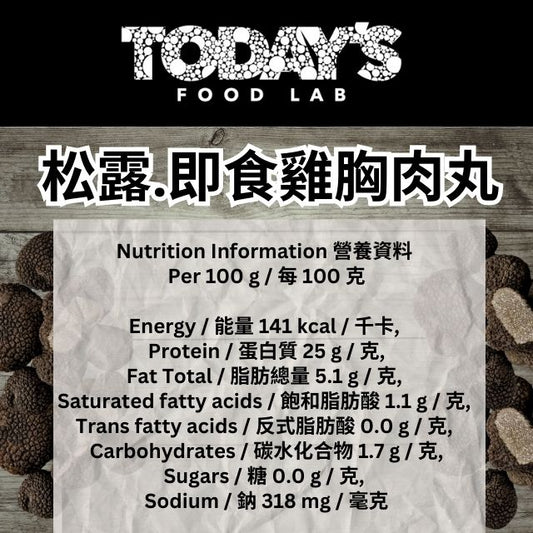 我們採用高質的泰國無激素、無抗生素雞胸肉手工製作這款肉丸。我地加入左適量魷魚令肉丸口感更佳。唔會因為雞胸肉而令肉丸又乾又鞋。現有三款口味:原味、四川麻辣和黑松露。這款肉丸非常適合早餐、小食、消夜、煮麵加餸甚至打邊爐。Today's Food Lab嘅即食雞胸肉丸幫你輕鬆、美味地補充蛋白質,為您的身體提供充足的能量。